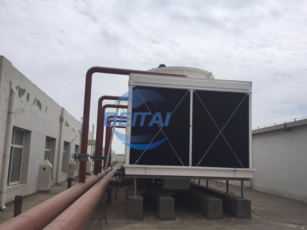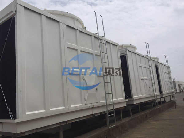 橫流式玻璃鋼冷卻塔內(nèi)的填料采用兩面有凸點(diǎn)的點(diǎn)波片,通過安裝頭使點(diǎn)波片粘結(jié)成整體,以提高剛性,兩面的凸點(diǎn)還可避免直接滴水,因此提高了水膜形成能力,填料尾部設(shè)有收水措施。