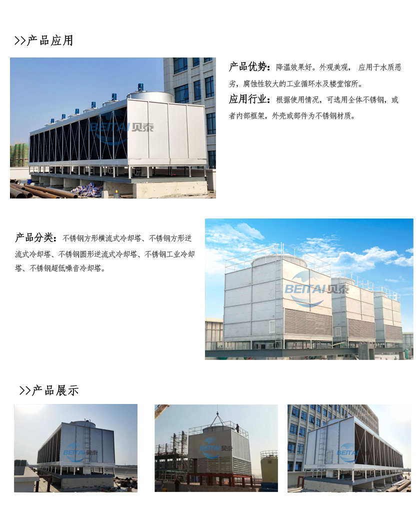 不銹鋼方型冷卻塔是根據(jù)產(chǎn)品的使用特點(diǎn),揉合國(guó)外先進(jìn)的熱交換技術(shù)與工藝生產(chǎn)科學(xué)管理,獨(dú)創(chuàng)于熱交換技術(shù)的冷卻塔.它具有重量輕、體積小、效率高、能耗低、便維修等一系列比使用常規(guī)冷卻塔佳的特點(diǎn)。